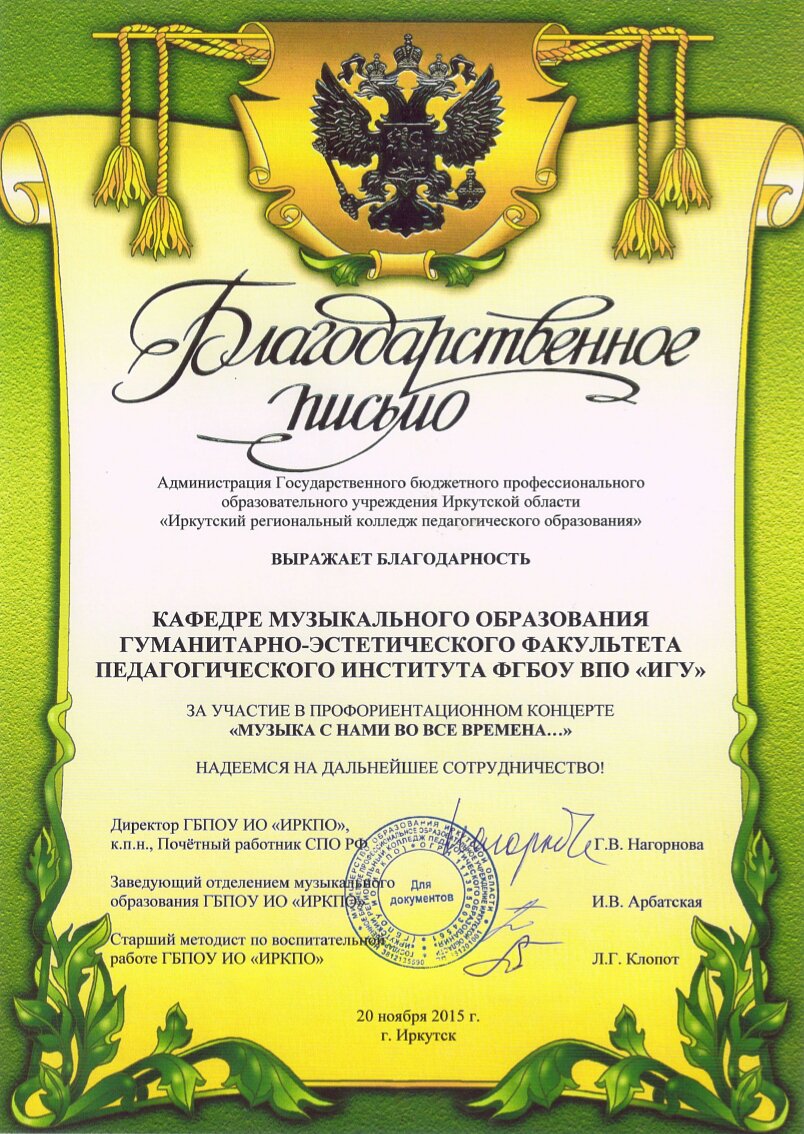 Профориентационная деятельность кафедры музыкального образования под руководством старшего преподавателя Лилии Георгиевны Седлецкой 20 ноября 2015 года развернулась в стенах ГБПОУ ИО «Иркутский региональный колледж педагогического образования».