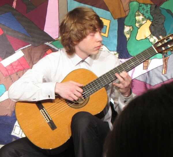 Божество, великолепие и пленяющую женскую красоту «воспевал» студент 2 курса Антон Демин (класс ассистента Н.П. Аникьевой) в пьесе для гитары В. Козлова «Баллада к Елене Прекрасной».