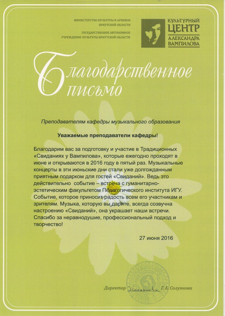 Слова благодарности от дирекции центра стали заключительным аккордом «Свиданий у Вампилова»: «V Традиционные «Свидания у Вампилова» открылись 27 июня 2016 года встречей с гуманитарно-эстетическим факультетом Педагогического института ИГУ. Вечер волшебной музыкой органично дополнили студенты с концертом «Музыка всюду живёт!», подготовленным под руководством своих замечательных преподавателей. Благодарим вас за участие в событии! Вокальное и инструментальное исполнение номеров музыкантами, в числе которых были лауреаты престижных конкурсов, гостям Центра А.Вампилова запомнится надолго! Творчества вам, вдохновенного развития!»